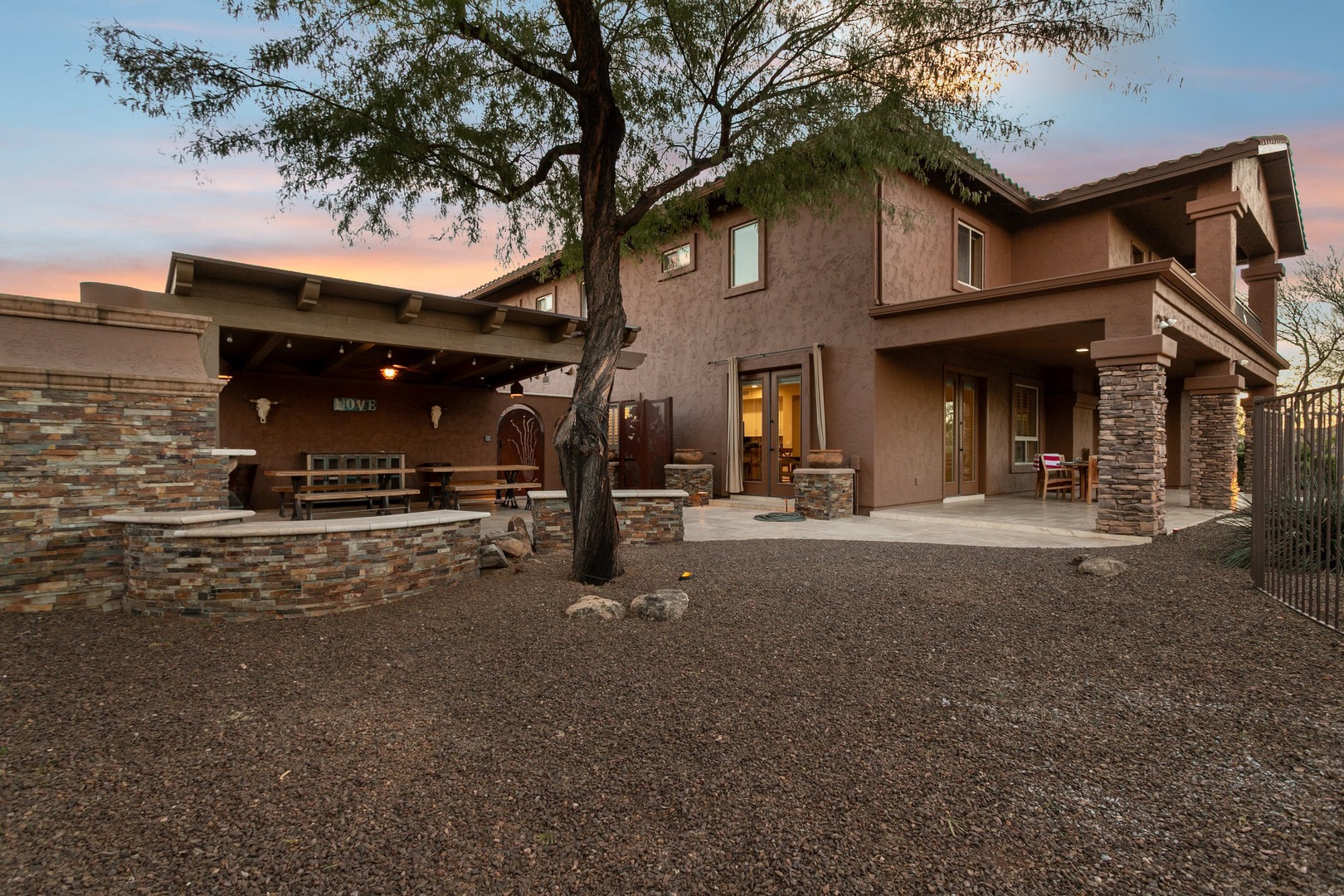 Gather around your private covered patio featuring rustic dining space, stone fireplace, and BBQ area - perfect for memorable evenings under ambient lighting.
