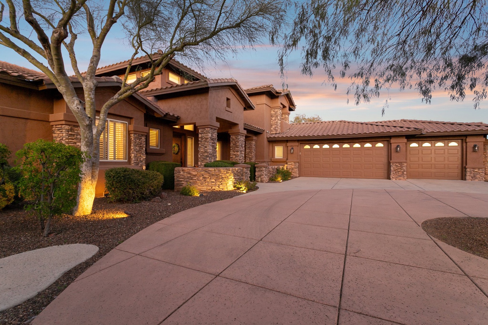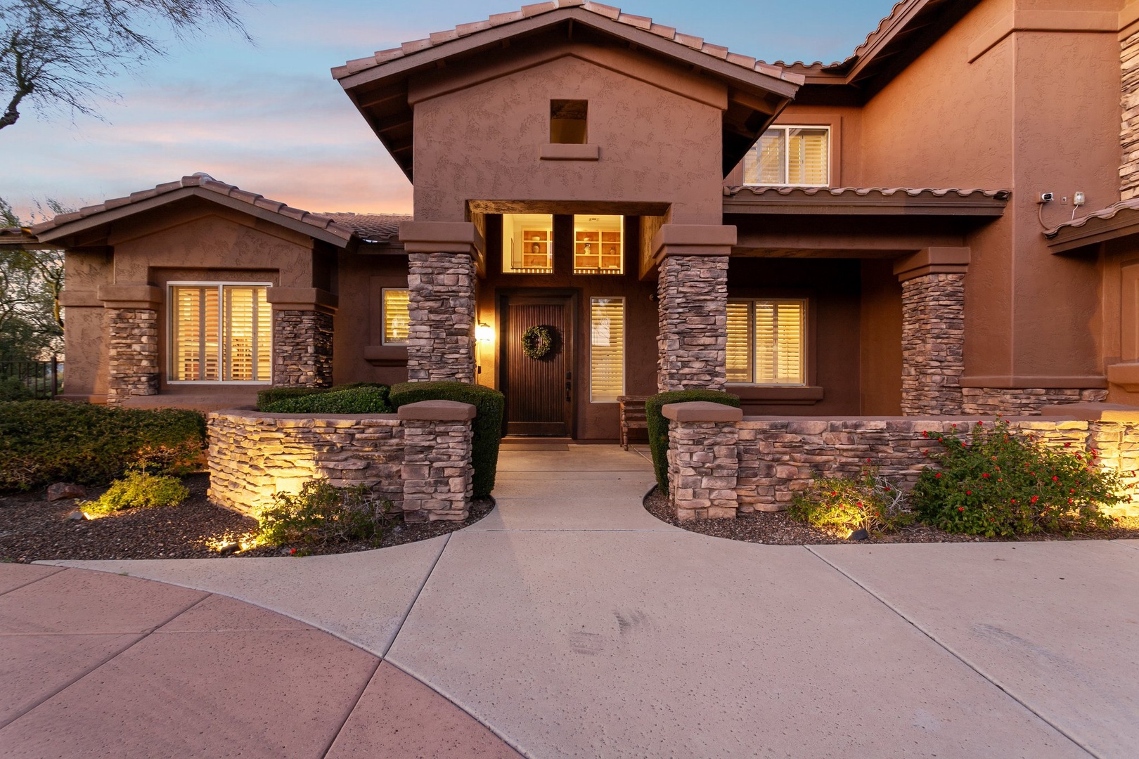 Elegant desert villa showcasing southwestern architecture with stone accents and desert landscaping at golden hour.