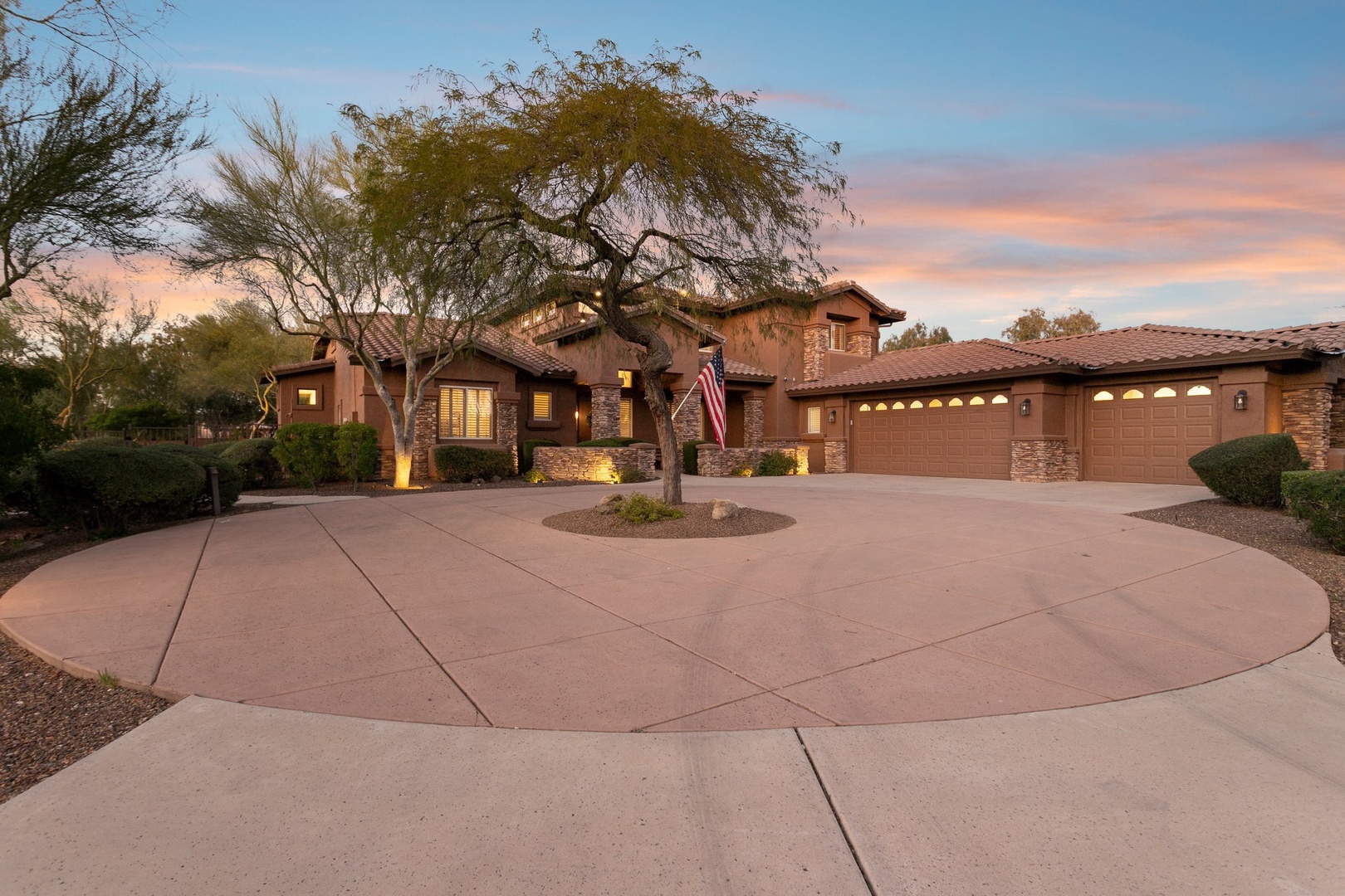 Beautiful desert landscape surrounds the property with mature trees and thoughtfully designed pathways leading through manicured grounds at sunset.